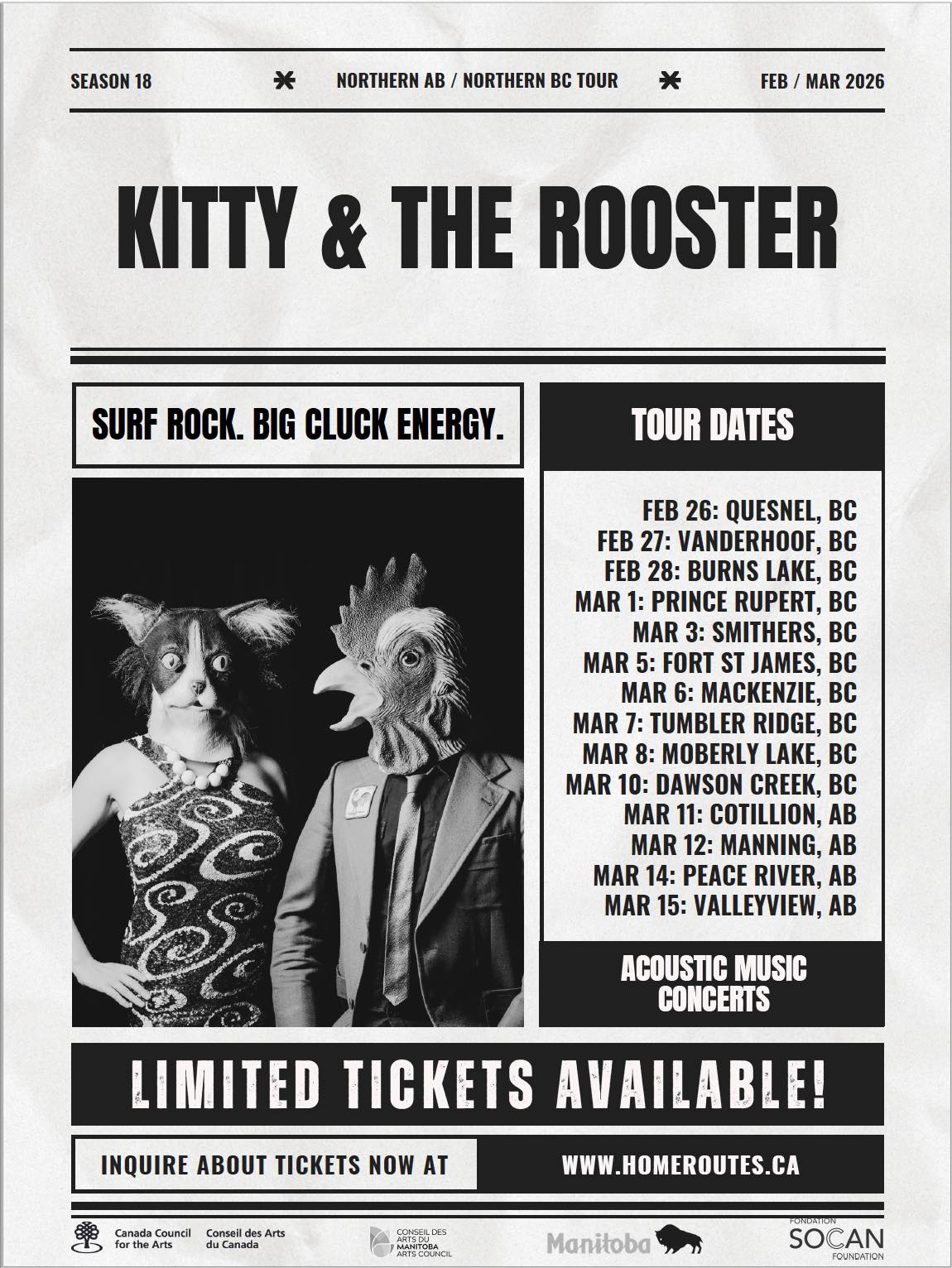 Home Routes presents: KITTY & THE ROOSTER Cock-a-doodle-doo, Northern BC & AB we’re coming for you!! Our Home Routes/Chemin Chez Nous tour starts this week, see you animals out there! Time: […]