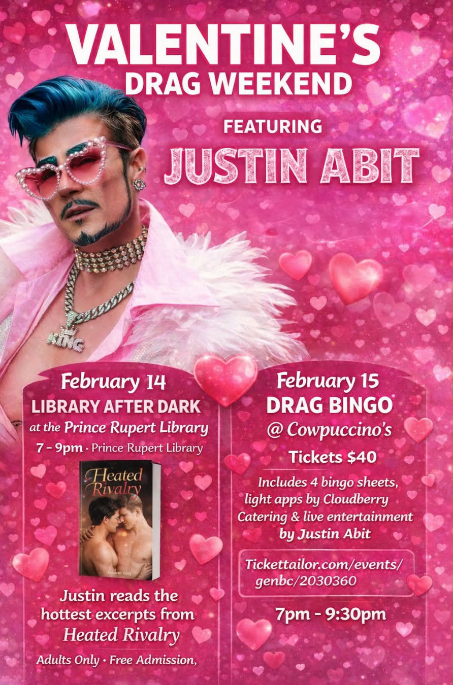 Drag Bingo at Cowpuccinos with the incredible JUSTIN ABIT. $40 per person Includes: 4 Bingo sheets, light appetizers by Cloudberry Catering, and entertainment by Justin Abit