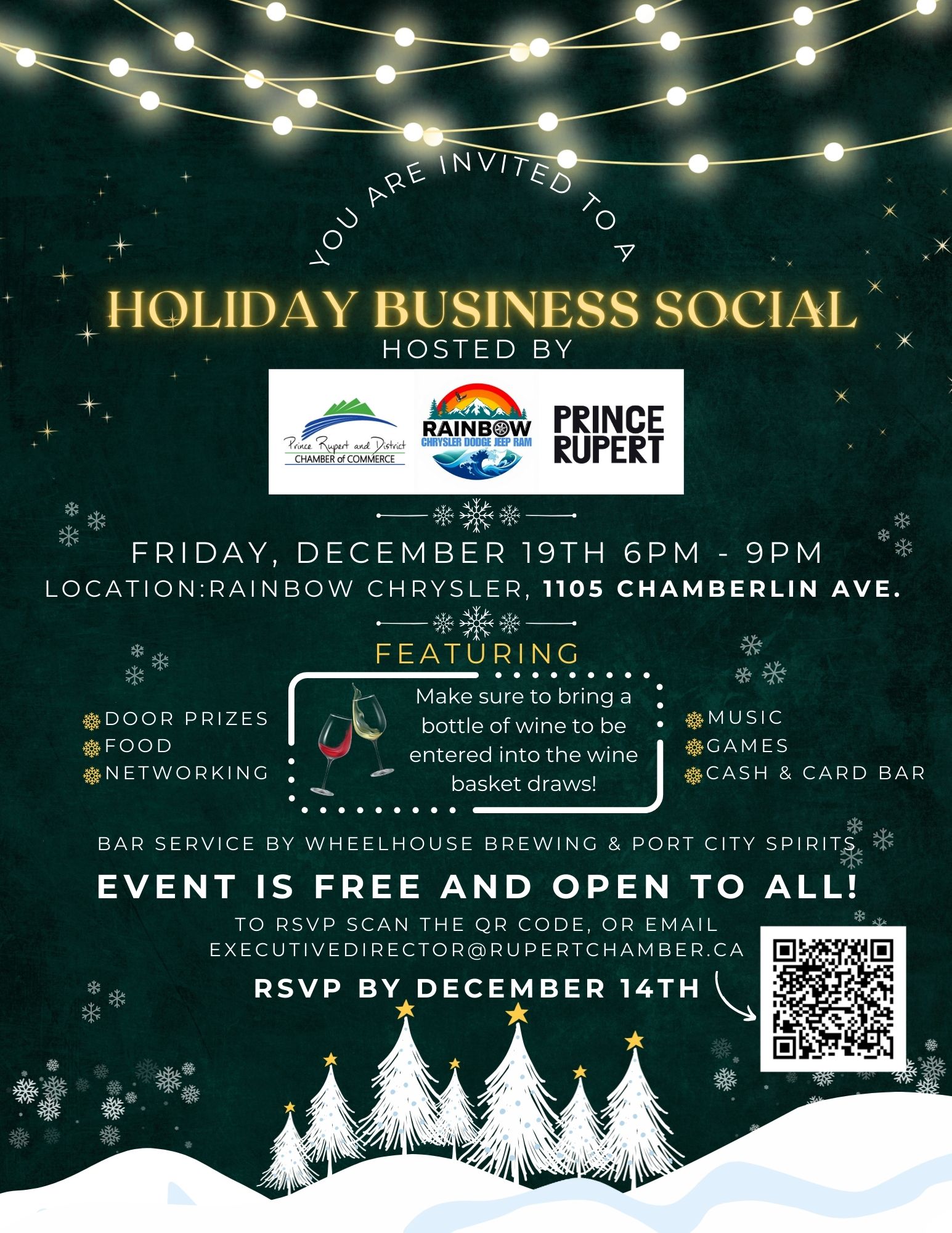 Prince Rupert — Get Ready for the Holiday Business Social! Our biggest year-end celebration is here, and YOU’RE invited!Join us for a magical evening filled with holiday cheer, great company, and unforgettable moments — proudly hosted by the Prince Rupert and District Chamber of Commerce, Rainbow Chrysler and Tourism Prince Rupert. Friday, December 19th 6 […]