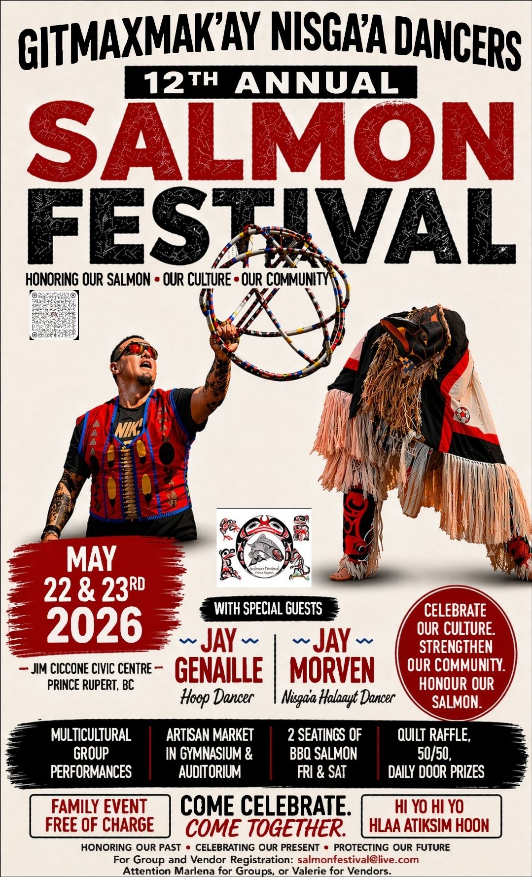 12th Annual Salmon Festival 2026 Friday, May 22 & Saturday, May 23, 2026 Jim Ciccone Civic Centre, Prince Rupert, BC Celebration of the arrival of salmon with the Gitmaxmak’ay Nisga’a community. This event brings people together to honour one of our most important traditional foods through culture, connection, and community spirit. What to expect: • […]