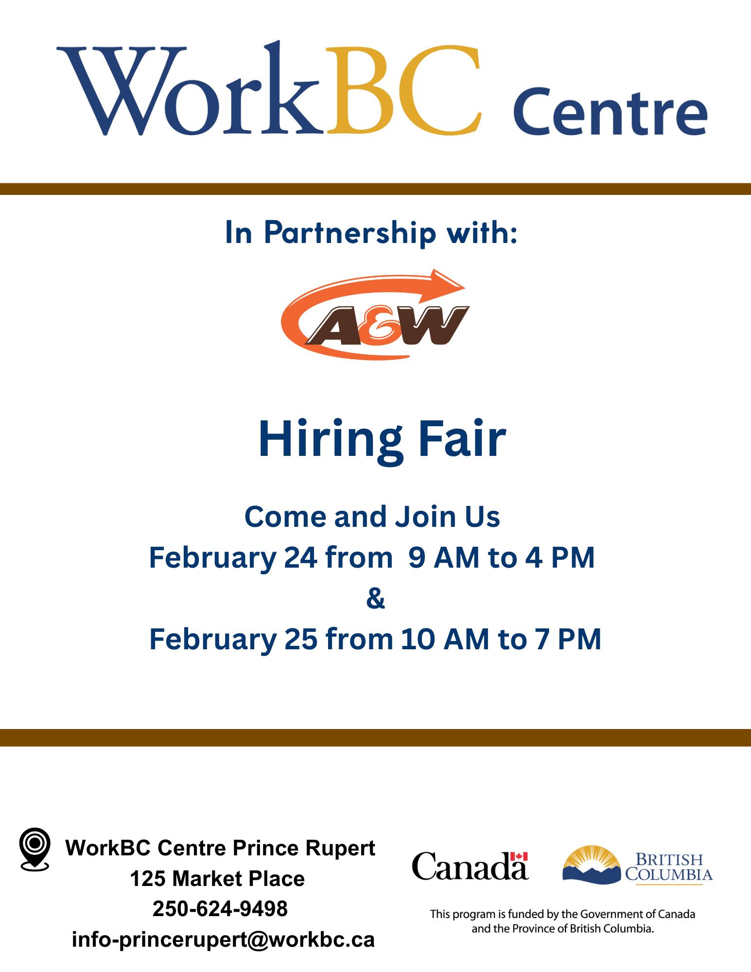 Looking for work? A&W is hiring! WorkBC Centre Prince Rupert is partnering with A&W for a Hiring Fair on February 24 (9 AM–4 PM) and February 25 (10 AM–7 PM). Stop by 125 Market Place or call 250-624-9498 for more info. Your next opportunity could be just around the corner!