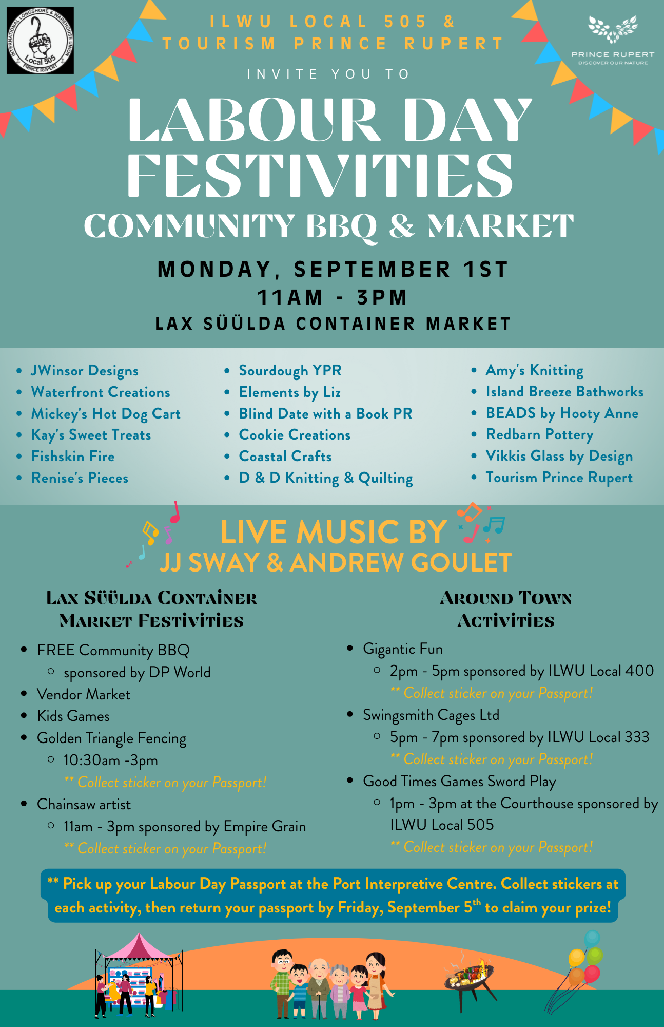 Tourism Prince Rupert is partnering with ILWU Local 505 to host a Labour Day Community BBQ & Market! Come out to shop local artisan vendors and enjoy delicious FREE eats from ILWU Local 505's community BBQ. Live music, kids games, chainsaw artist, and so much more at the container market site and around Prince Rupert. […]