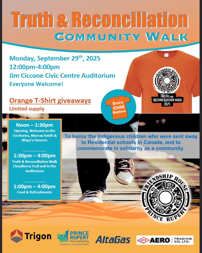 Mark your calendar for the fourth annual Truth and Reconciliation Community Walk in Prince Rupert on Monday September 29th. The Friendship House Association of Prince Rupert's event will be hosted in the Jim Ciccone Civic Centre Auditorium and on the nearby Cloudberry Trail from 12pm to 4pm. All are welcome. Please remember to wear orange.