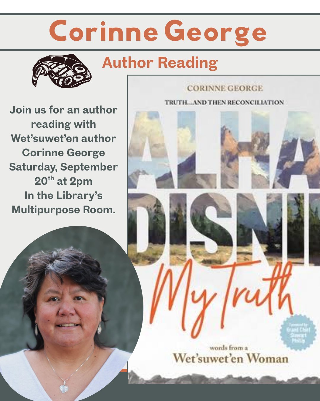 Corinne George, author of "Alha Disnii : My Truth : Words from a Wet'suwet'en Woman" is coming to our library!Saturday, September 20th at 2pm in the Library Multipurpose Room.
