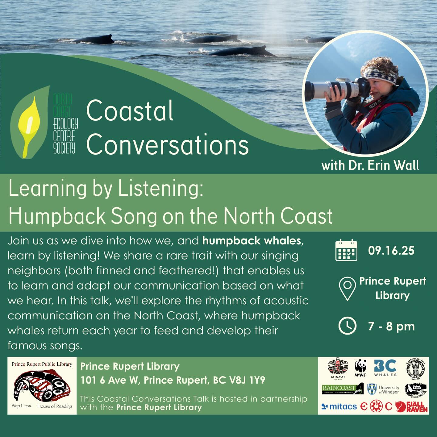 Coastal Conversations are back at the Prince Rupert Library on September 16th! We’ll chat about how listening can help us uncover new insights about humpback  whale behavior, and the importance of their time here on the feeding grounds. Erin Wall @erinmckz will share about her postdoc research in collaboration with @bcwhales, @raincoastconservation @ibiouwindsor, supported by […]